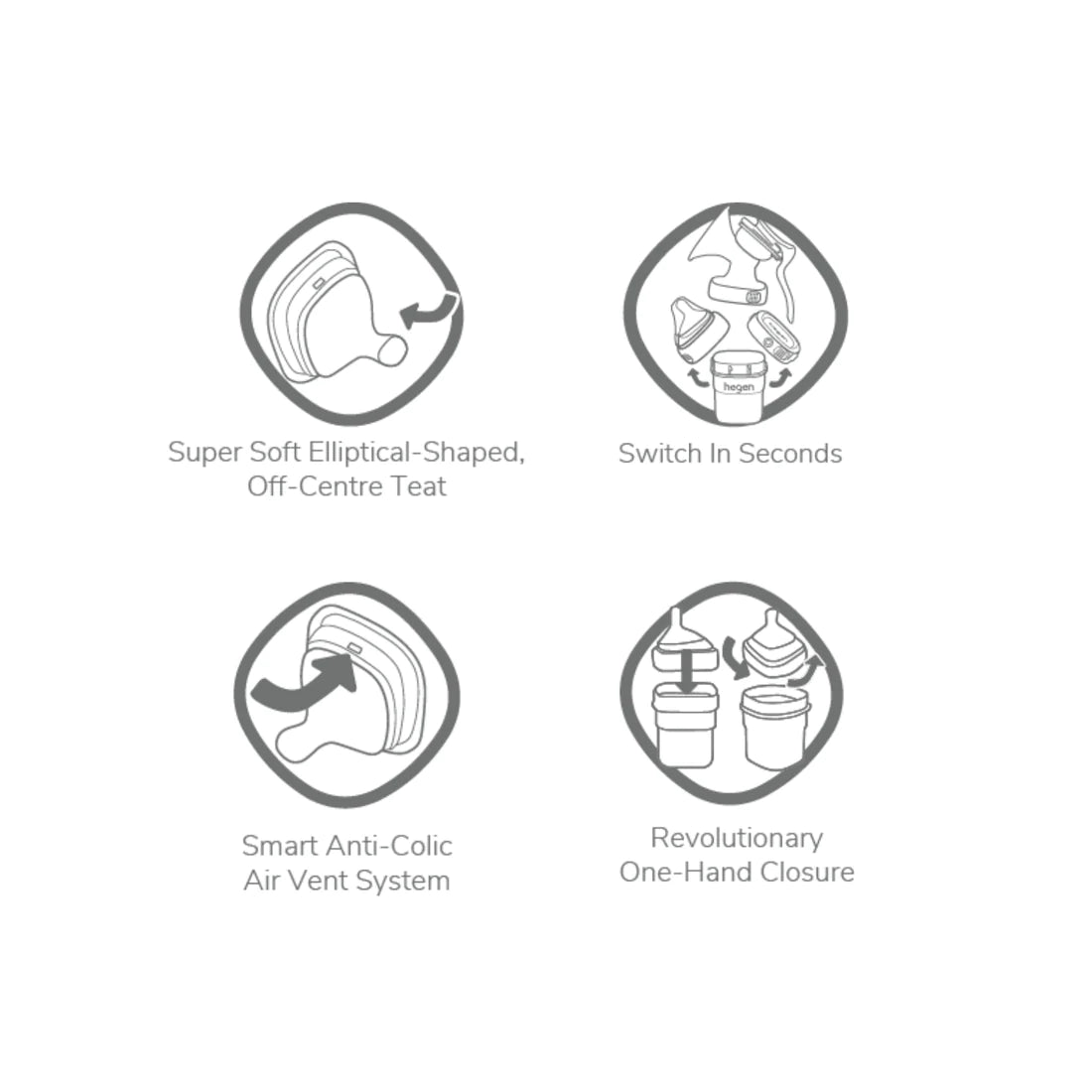 Hegen’s 240ml/8oz Feeding Bottle is an ideal size to meet the growing appetite of babies. It comes with a Medium Flow teat that is suitable from the third month as the teat hole becomes bigger and gradually increases milk flow rate. The larger storage capacity also caters to a mother’s established milk flow and increased volume.