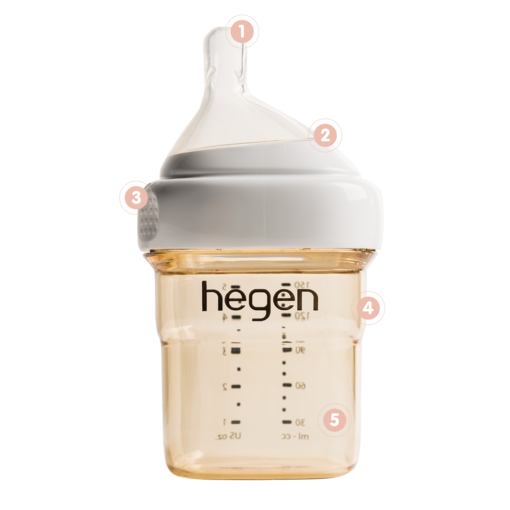 Hegen’s super soft teats are asymmetrical and off-centre to allow for a natural upright feeding position at a 20 degrees tilt, similar to nursing at the breast. This minimises the tilt that conventional baby bottles require, reducing the risk of milk back-flow, which may cause mid-ear complications.