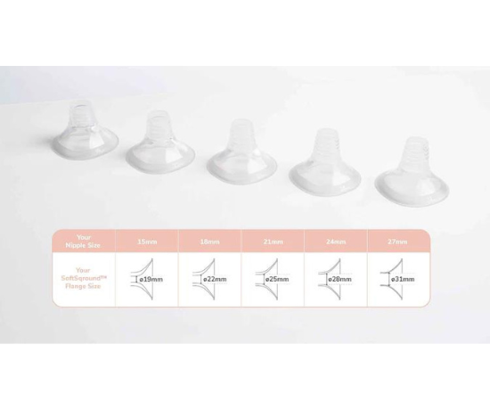 Now available in 5 sizes, the all-new SoftSqround™ flanges has a unique Hegen sqround™ shape that allows for mums to adjust angles and find the best fit for different breast sizes. Tilt it into a diamond shape when you have a very full breast for best adhesion to optimise yield. See how you can take an accurate nipple measurement to determine your flange size.