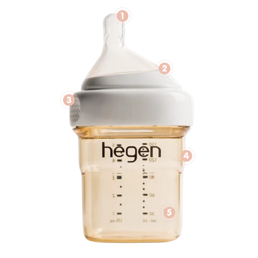 Hegen’s super soft teats are asymmetrical and off-centre to allow for a natural upright feeding position at a 20 degrees tilt, similar to nursing from the breast. This minimises the tilt that conventional baby bottles require, reducing the risk of milk back-flow which may cause mid-ear complications.